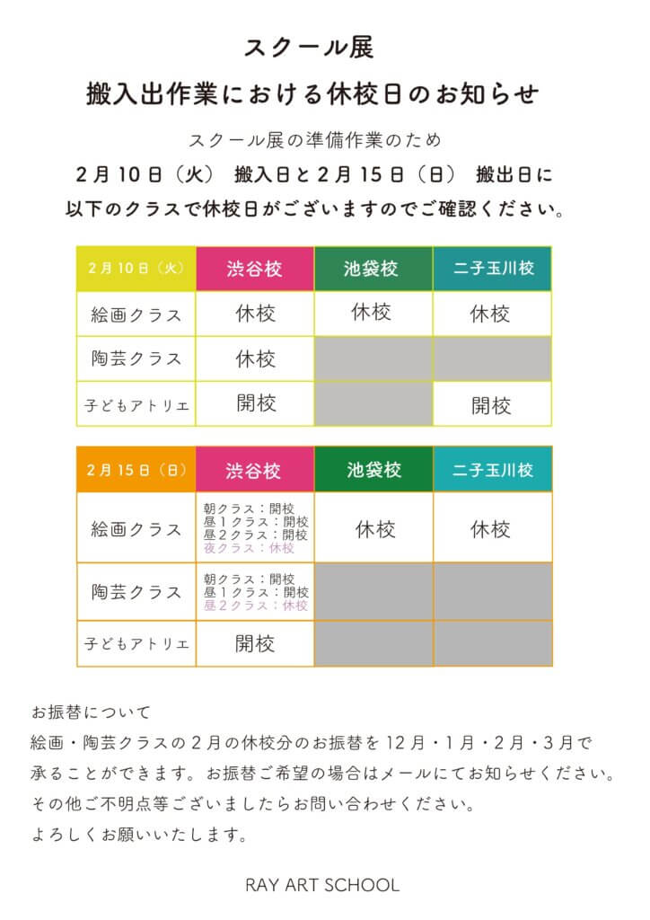 絵画クラスの2月の休校日分のお振替を12月・1月・2月・3月で承ることができます。