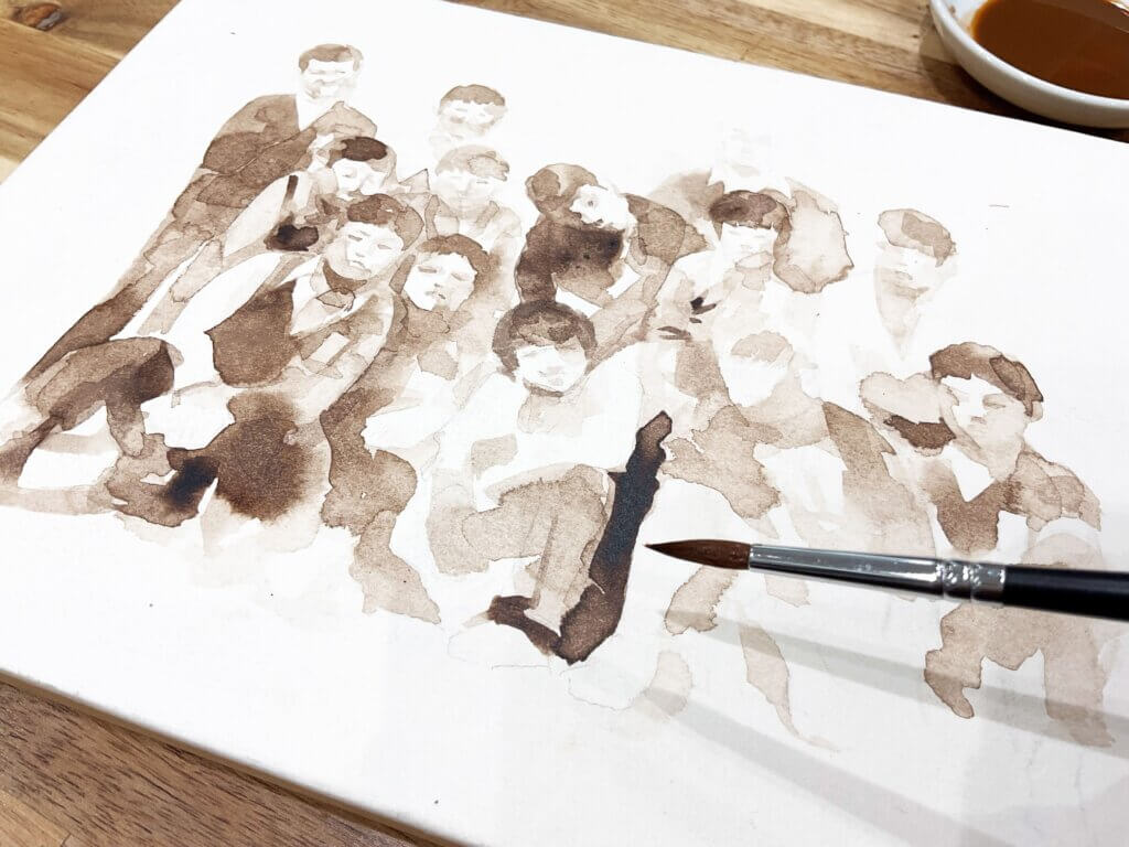 水彩絵の具のほか、墨、柿渋、木炭粉など、レトロな素材を使って主に人物を描きます。