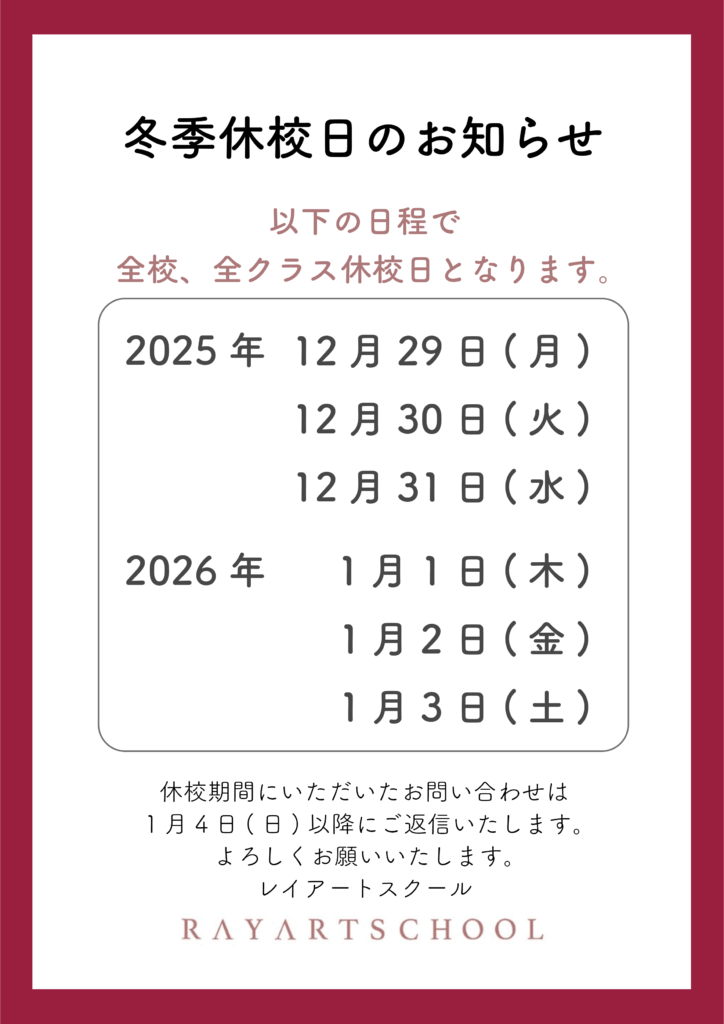 以下の日程で、レイアートスクール全校で休校日となります。