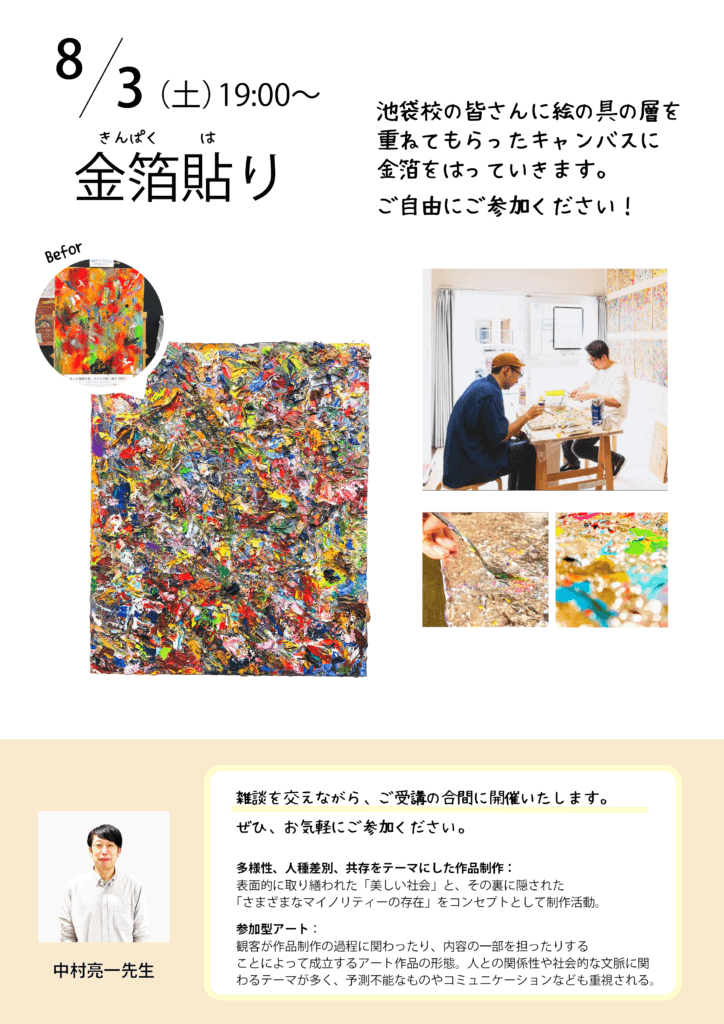 8/3(土)夜クラス内で、金箔貼り体験を実地いたします。池袋校の皆さんに絵の具の層を重ねてもらったキャンバスに金箔をはっていきます。※通常受講の合間にお気軽にご参加いただけます。雑談を交えながら、ぜひ参加型現代アートに触れてみてください。